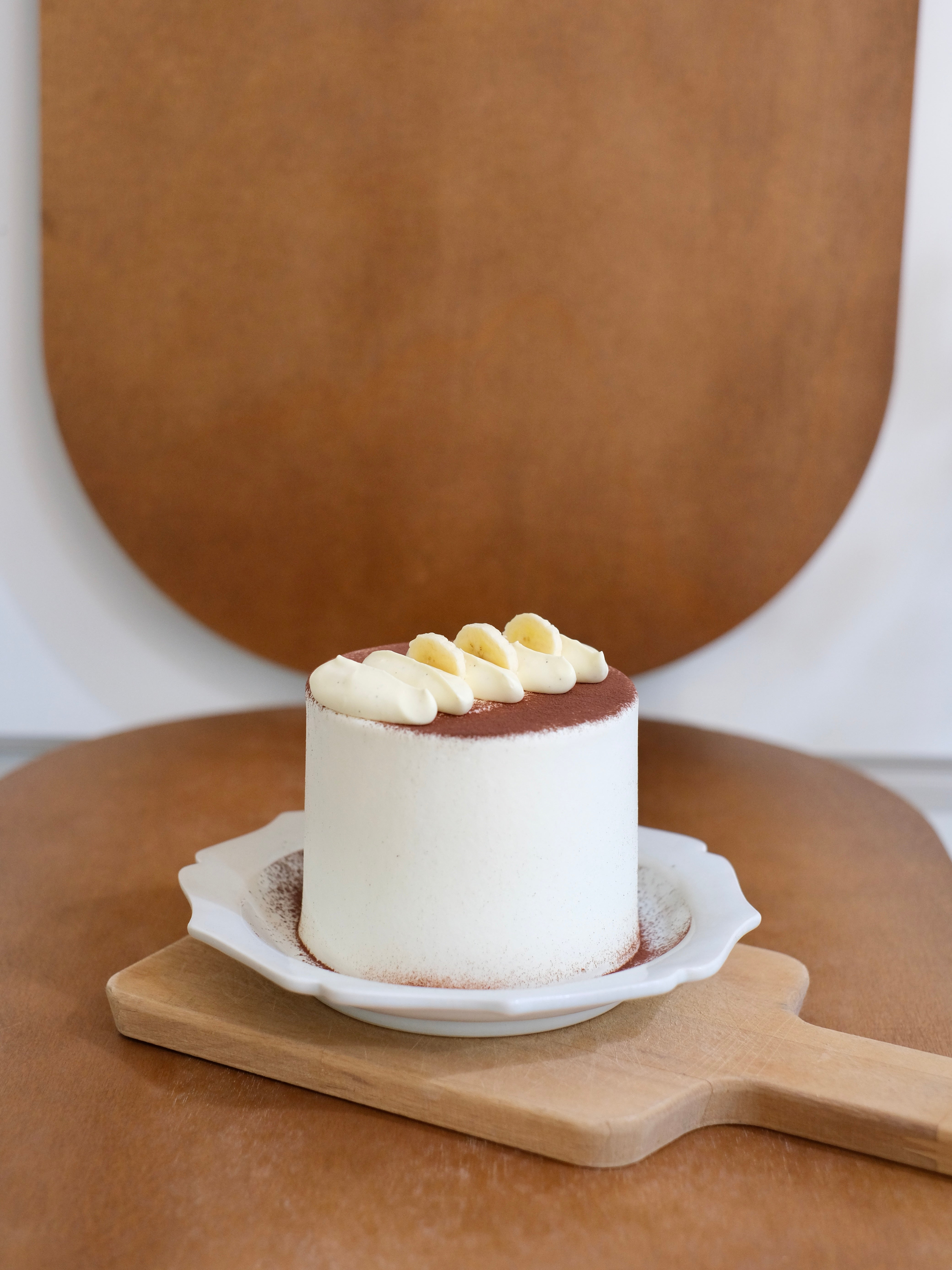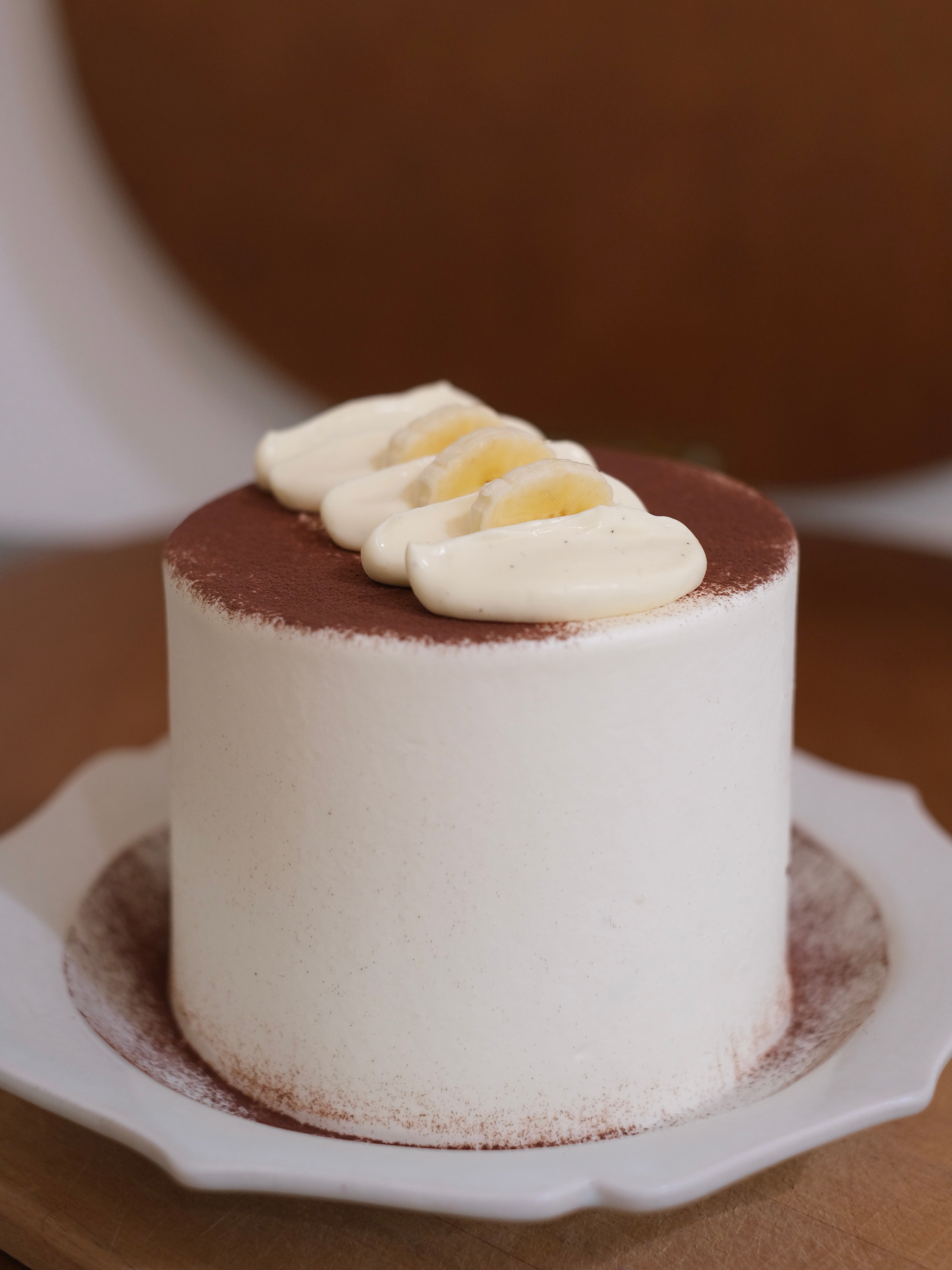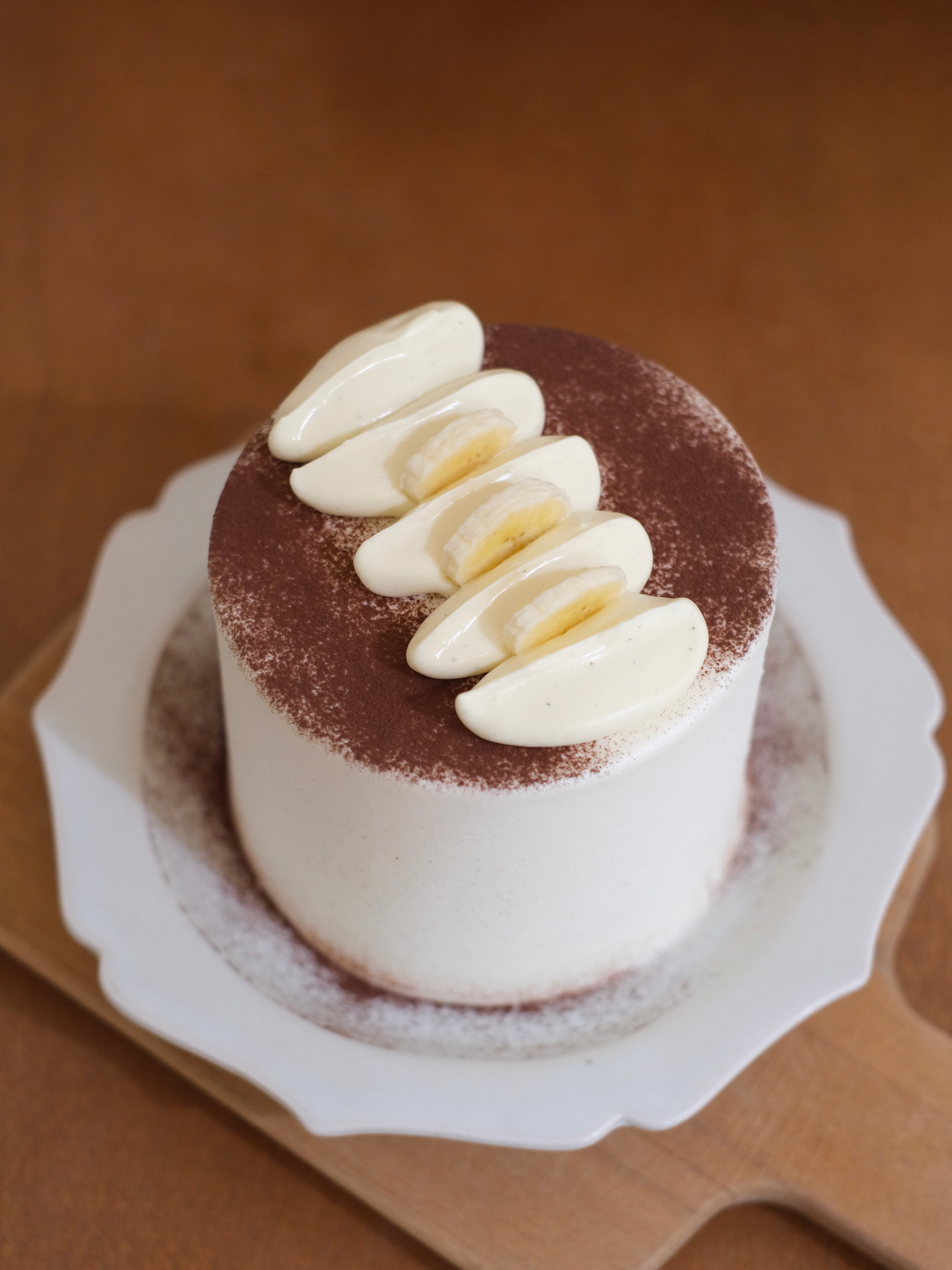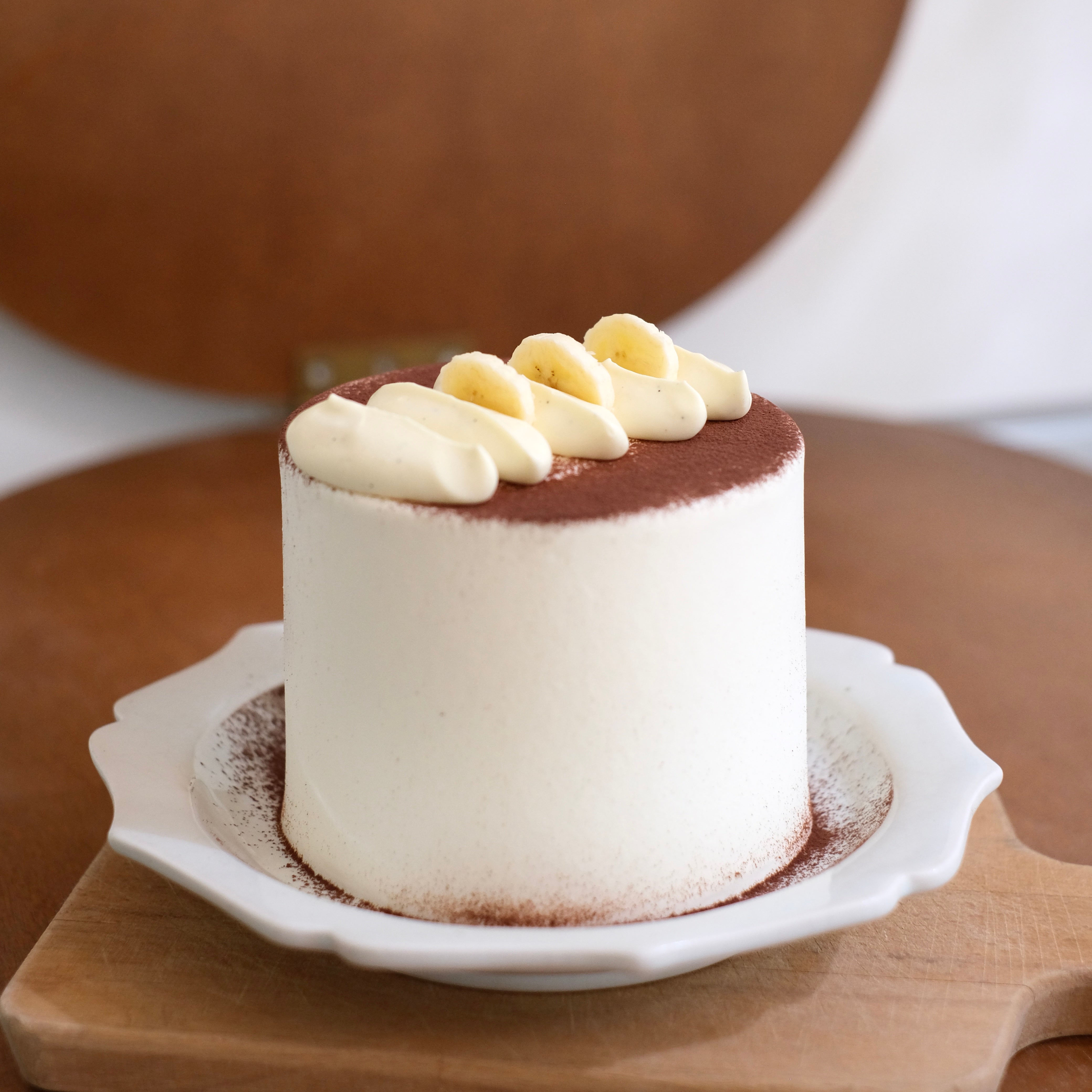 以朱古力戚風蛋糕作基底,其中一夾層用上Valrhona 黑巧克力甘納許配新鮮香蕉,香甜軟糯的香蕉柔化了黑巧克力的微苦,是完美的組合! 另一夾層則以香草卡士達醬結合香緹忌廉而成的香草外交官奶油,配上焦糖香蕉。外交官奶油口感順滑,更能突出焦糖香蕉的焦香味道!