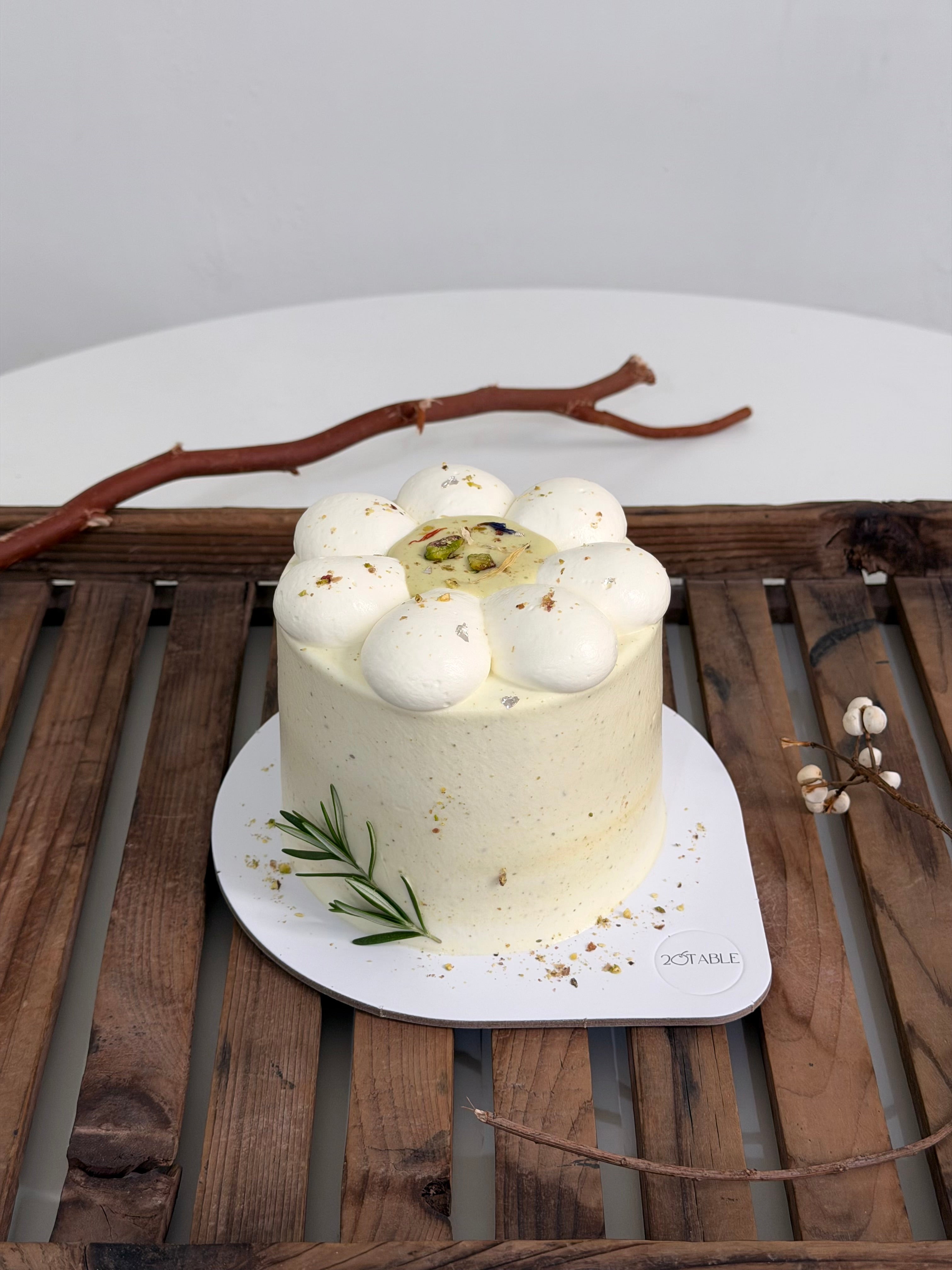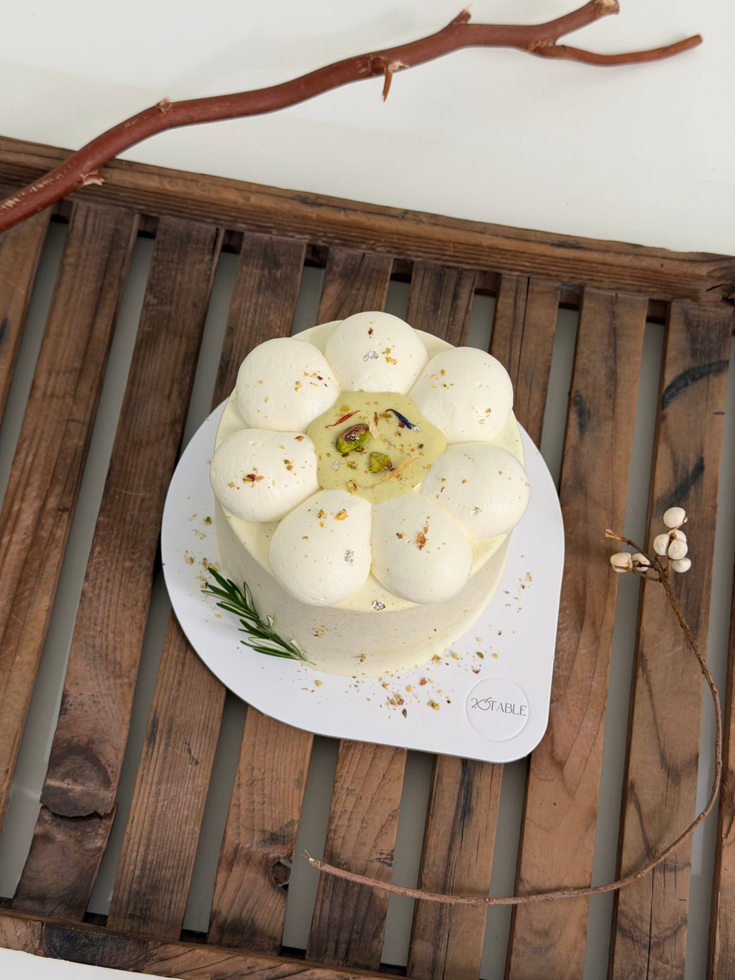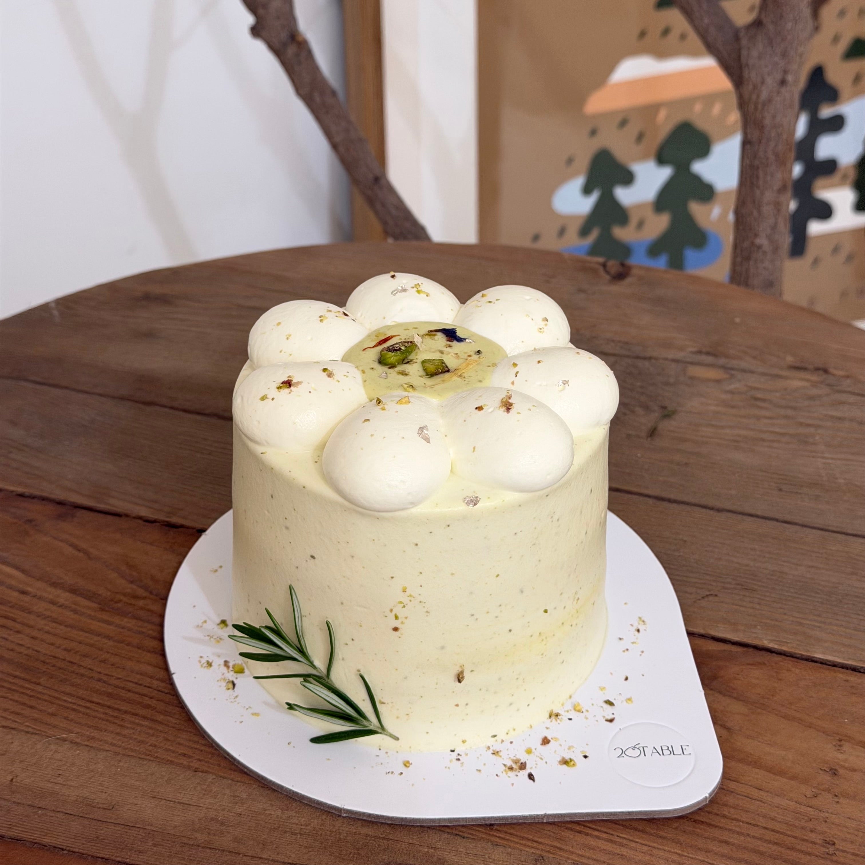 以台灣茉莉花茶粉製作戚風蛋糕,選用伊朗出產的開心果自家製作開心果醬及開心果忌廉,蛋糕除了兩層開心果忌廉外,還加入烘烤過的焦糖開心果粒及開心果醬, 令開心果味更突出!另外一層則加入清爽Q彈的黃豆粉蕨餅,增添層次外還能解膩!蛋糕面的中心則加入自家調配的開心果芝士奶蓋,使口感更豐富!