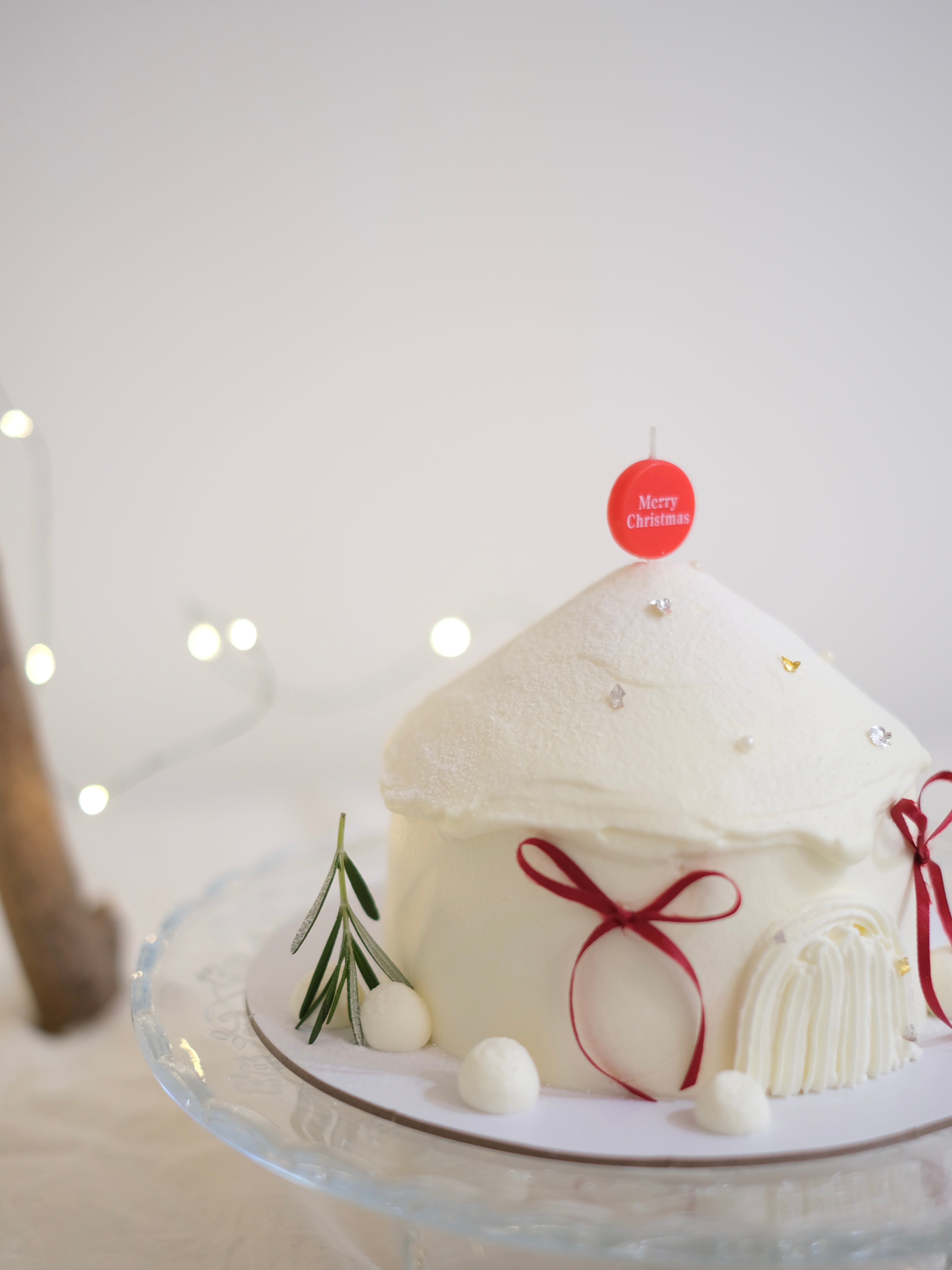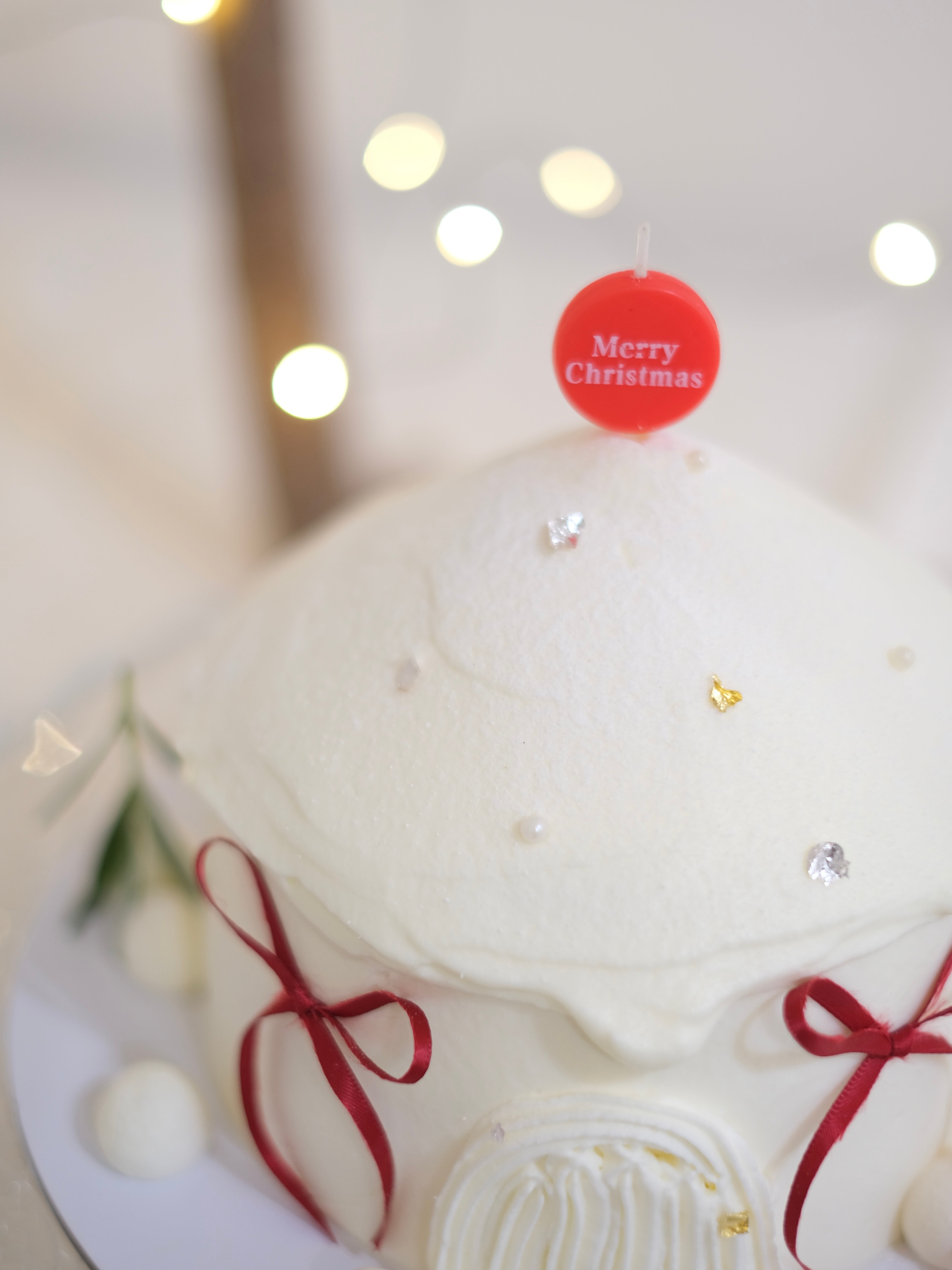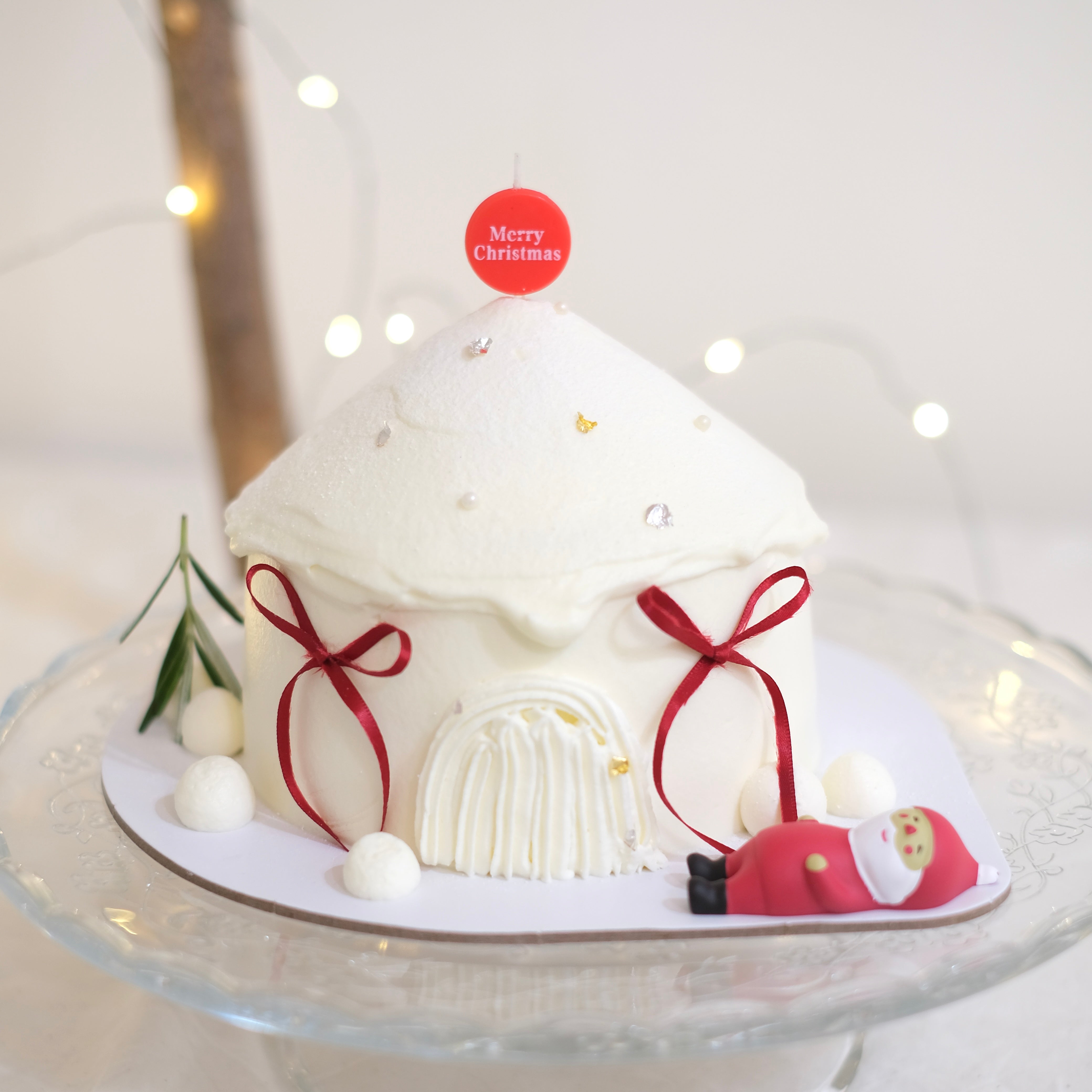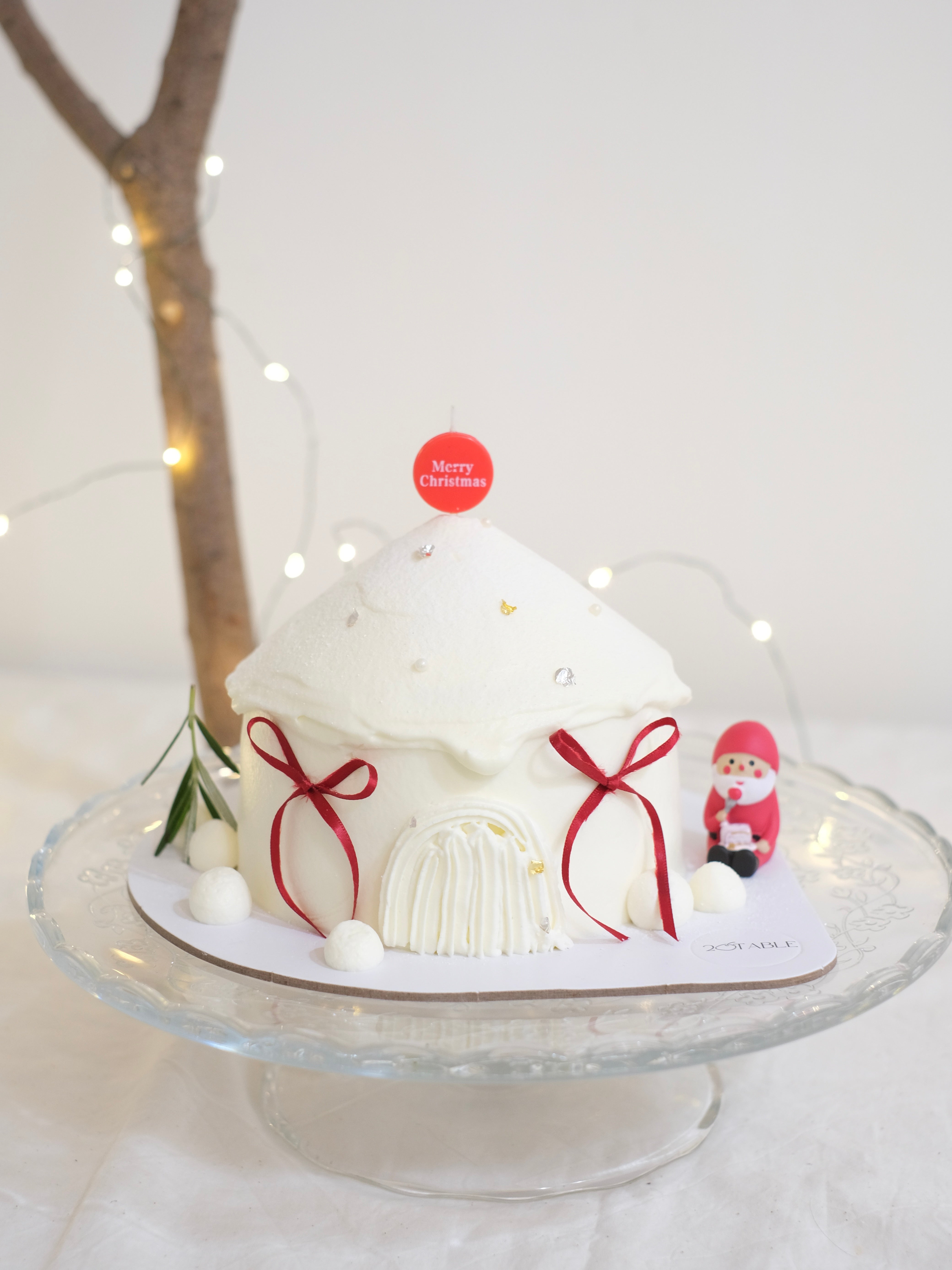 今年聖誕蛋糕以聖誕老人雪屋為主題!幻想聖誕老人的屋子是白雪雪鋪滿雪及閃閃的!因此屋頂以食用金箔及銀箔點綴。隨機附送不同樣式的可愛聖誕老人模型及隨機附送雪屋頂部之綠色或紅色的Merry Christmas 圓形蠟燭 (如需指定顏色,可聯絡我們)。