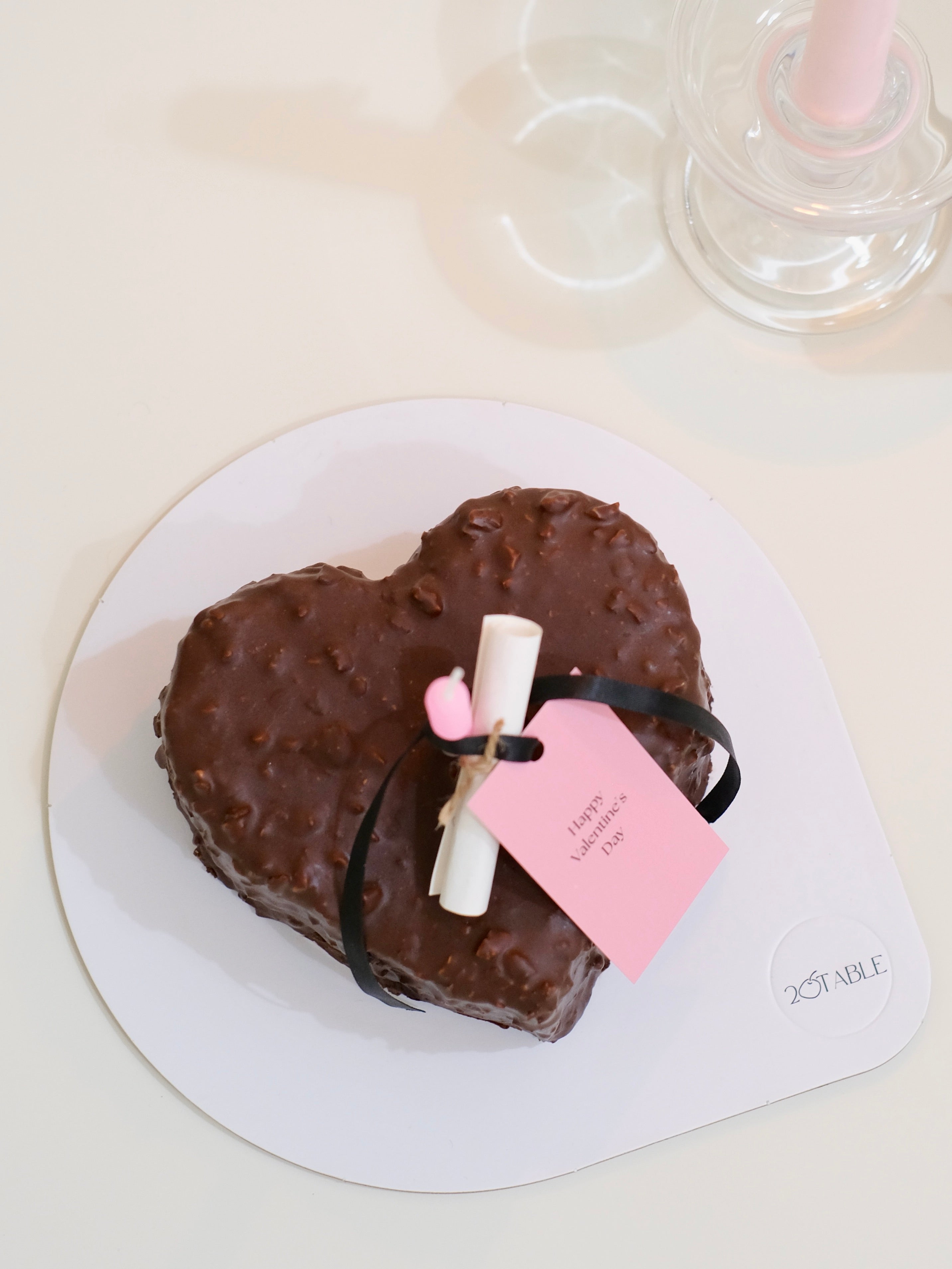 三重朱古力的變奏:外層以Valrhona黑巧克力及果仁碎製作成的朱古力脆皮包裹着整個心形蛋糕。裏面以三層朱古力戚風蛋糕作基底及Valrhona 黑巧克力甘納許作夾層。